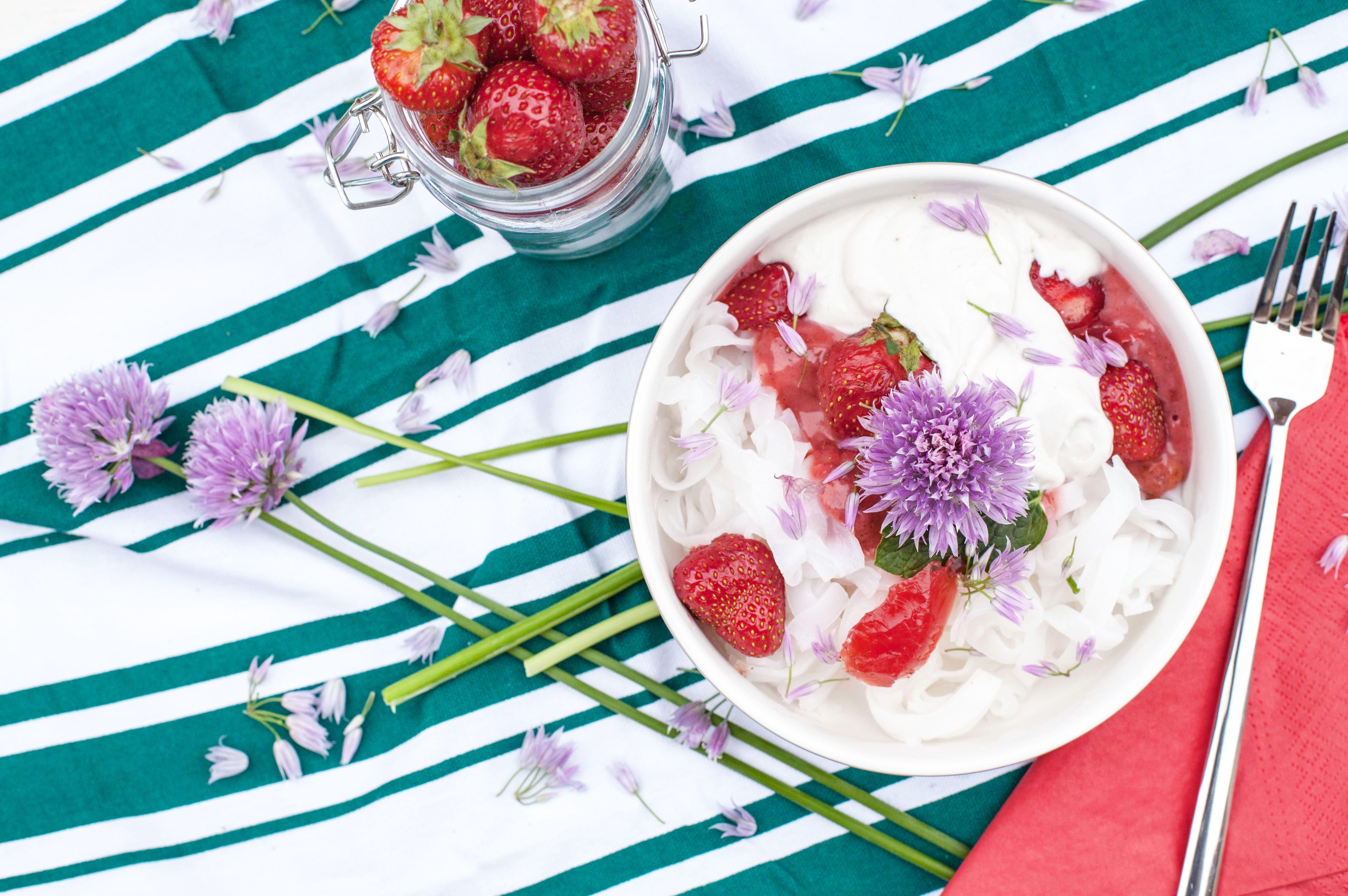 Makaron ryżowy z truskawkami, kokosową śmietanką i chipsami kokosowymi {v, gf, sf}